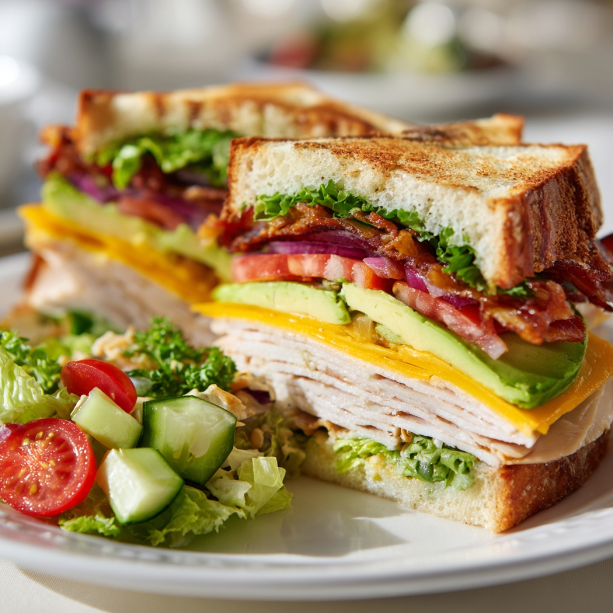 - On the first slice, layer lettuce, 4-6 oz sliced turkey, and 2 slices cheddar. Top with second slice of bread, then add 2 bacon strips, ½ avocado, and 2 tomato slices. Finish with the last slice of bread.