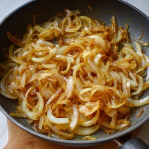 - Slice 3-4 onions thinly. Melt butter in skillet over medium-low heat. Add onions with a pinch of salt and cook slowly for 25-30 minutes, stirring every 5 minutes until deep golden brown.