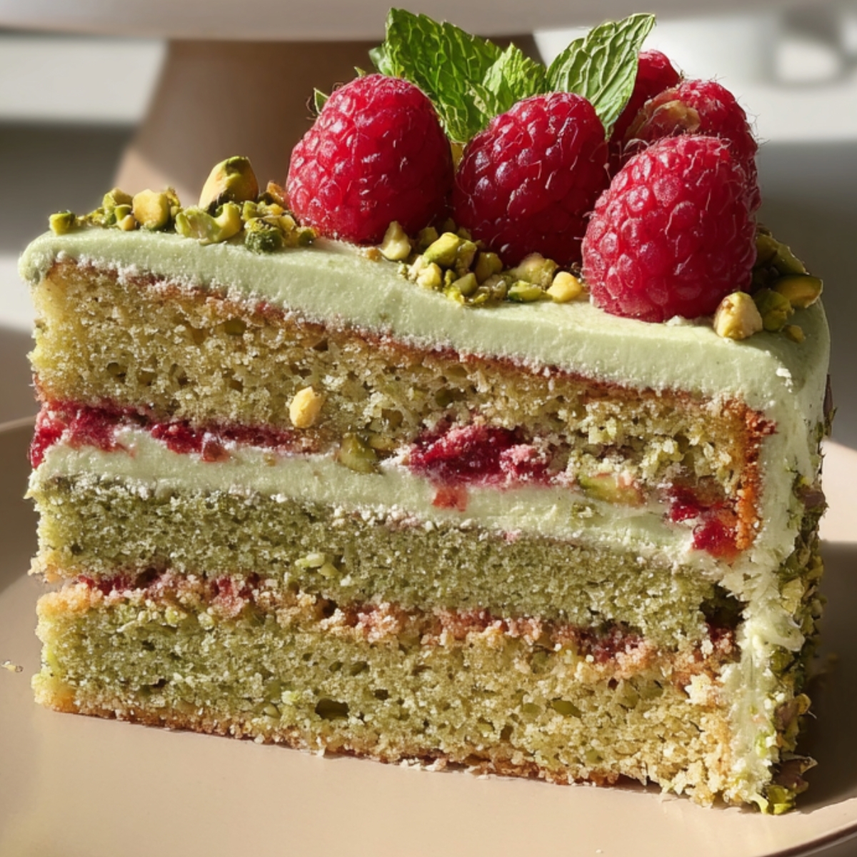 Gorgeous presentation. The pale green pistachio sponge, creamy buttercream, and bright red raspberries make this cake look like something from a bakery window.