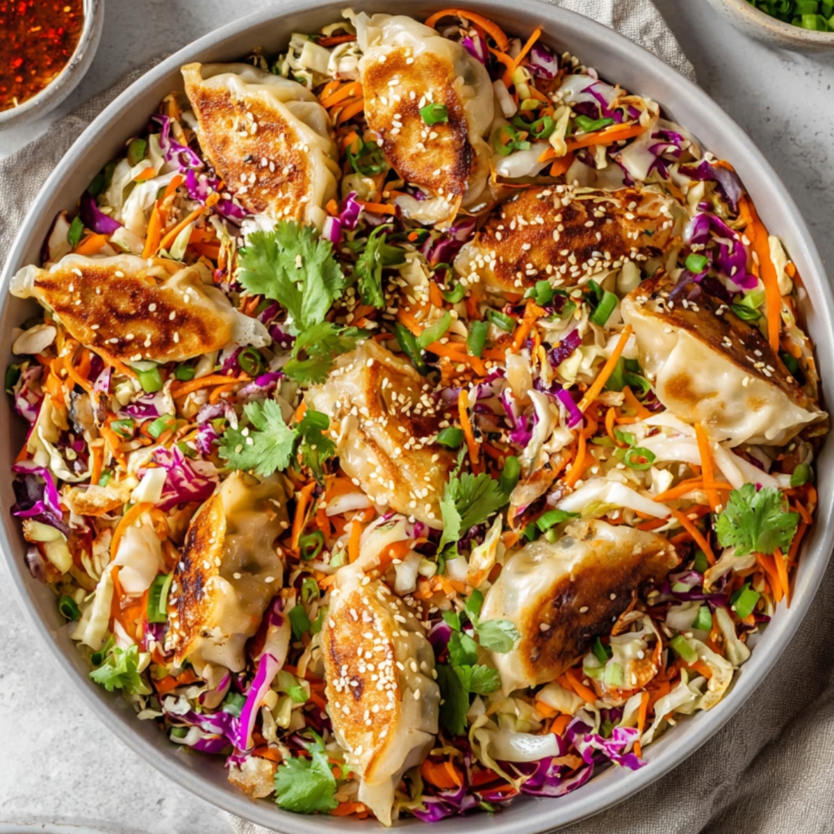 Unlike traditional salads, this one centers around crispy dumplings instead of lettuce. The warm dumplings meet cool coleslaw, fresh cilantro, and green onions, all tossed in a dressing made with soy sauce, rice vinegar, sesame oil, and sweet chili sauce. It's a complete meal in one bowl, and you can make it your own by swapping proteins, adding cucumbers or tomatoes, or adjusting the spice level.