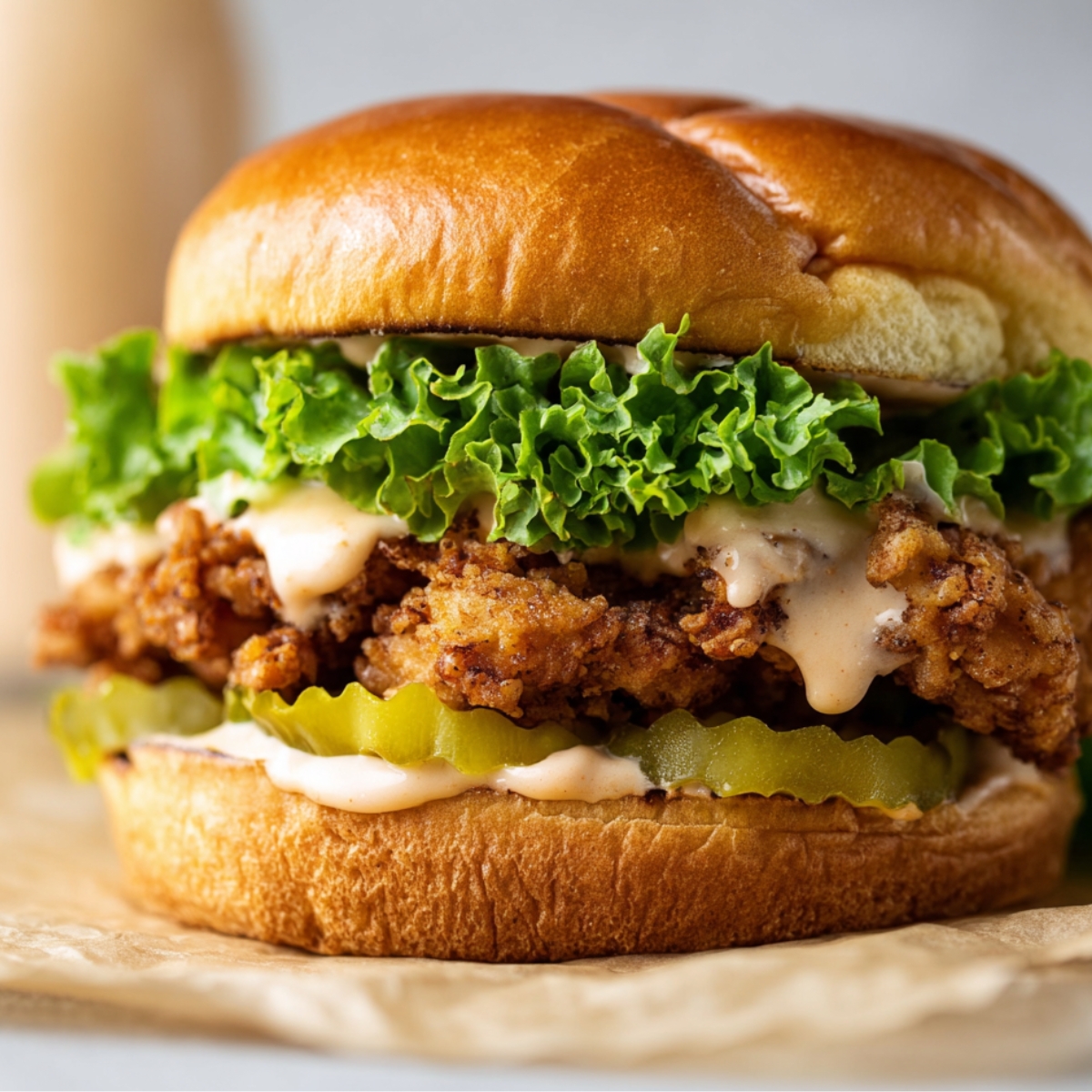- Toast the buns if desired, then layer each with fried chicken, pickles, lettuce, cheese, and sauce before serving.